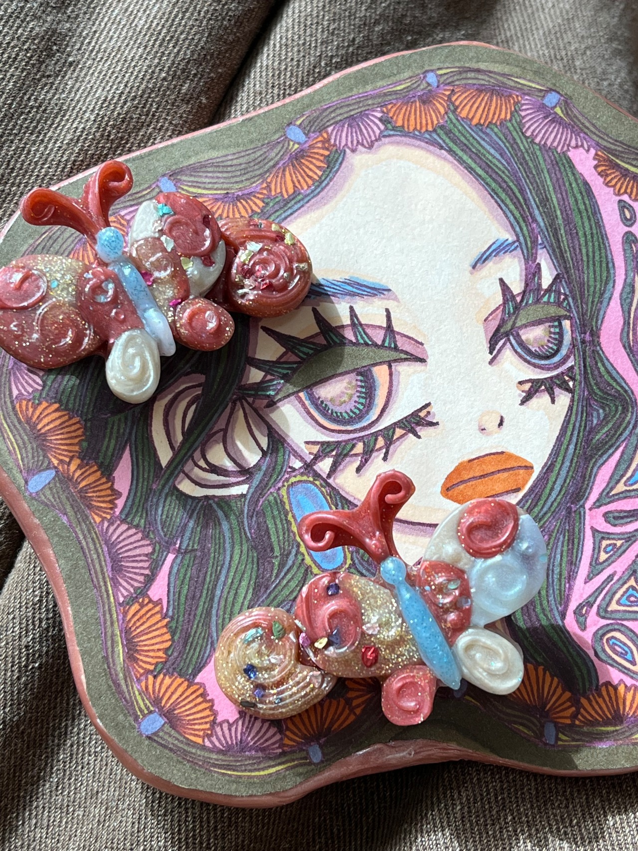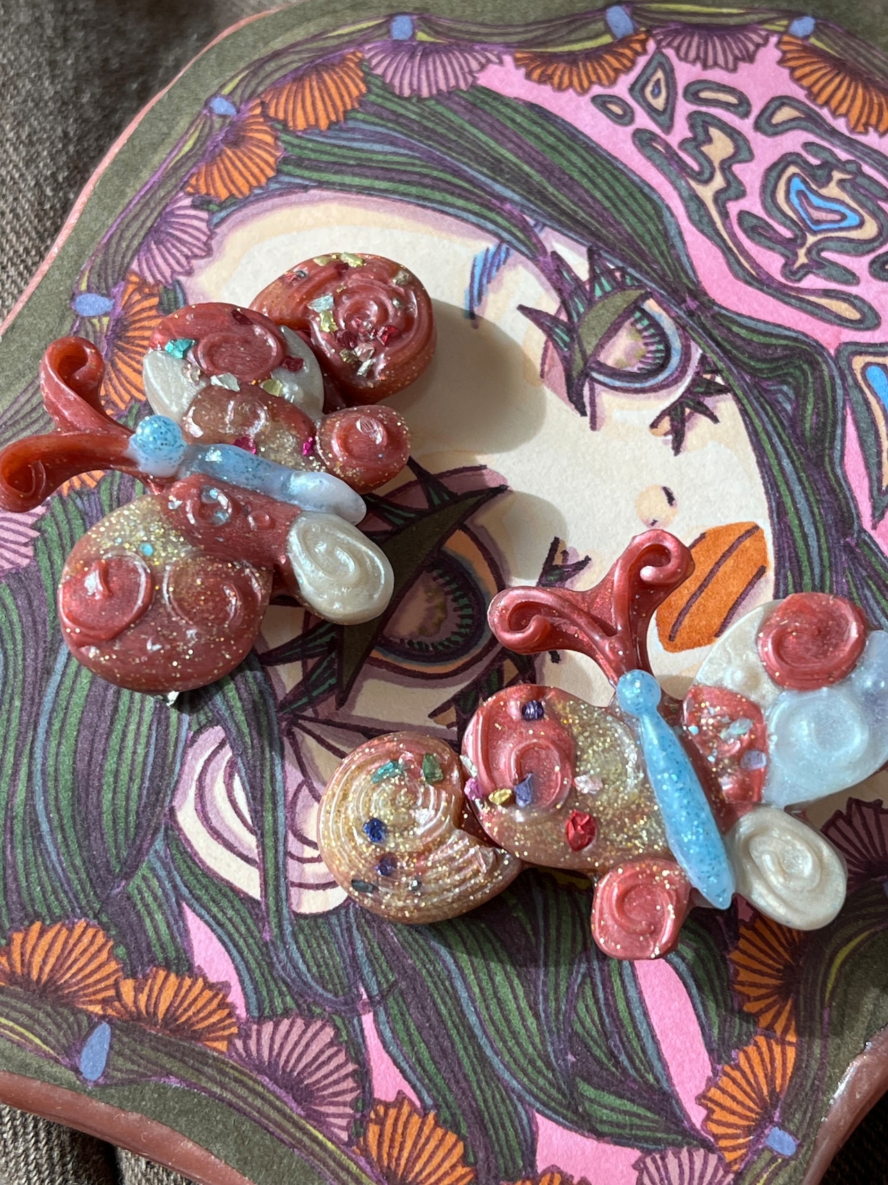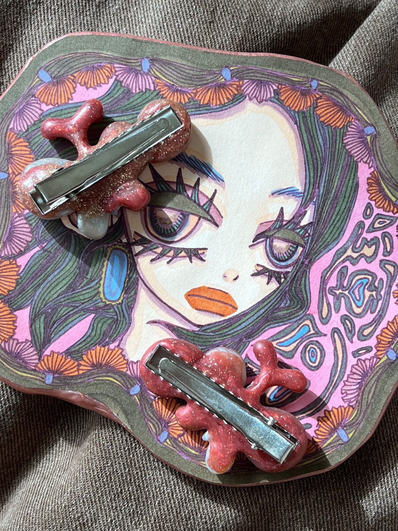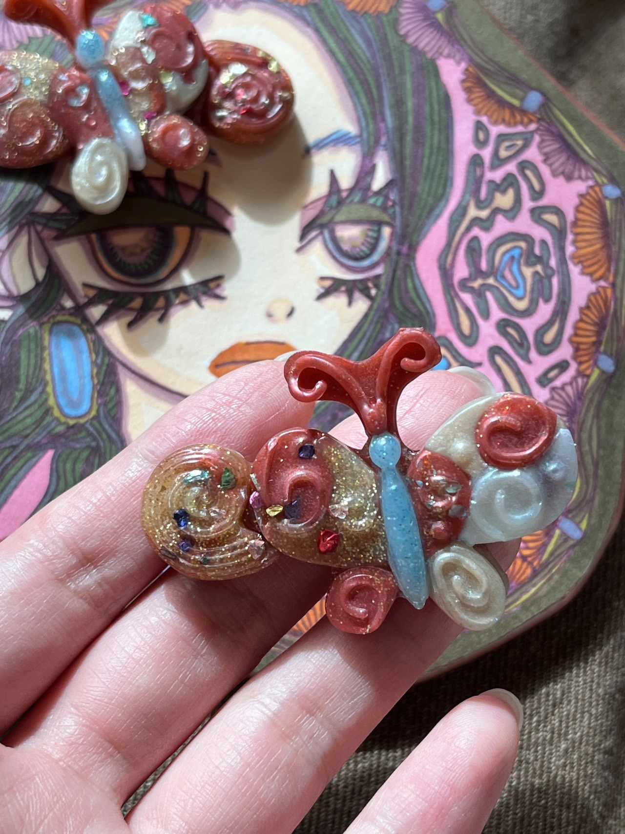 パッチワークのような雰囲気のちょうちょヘアピンです。たくさんの色を使って作っているので色んなファッションに合いそうです~.。☆