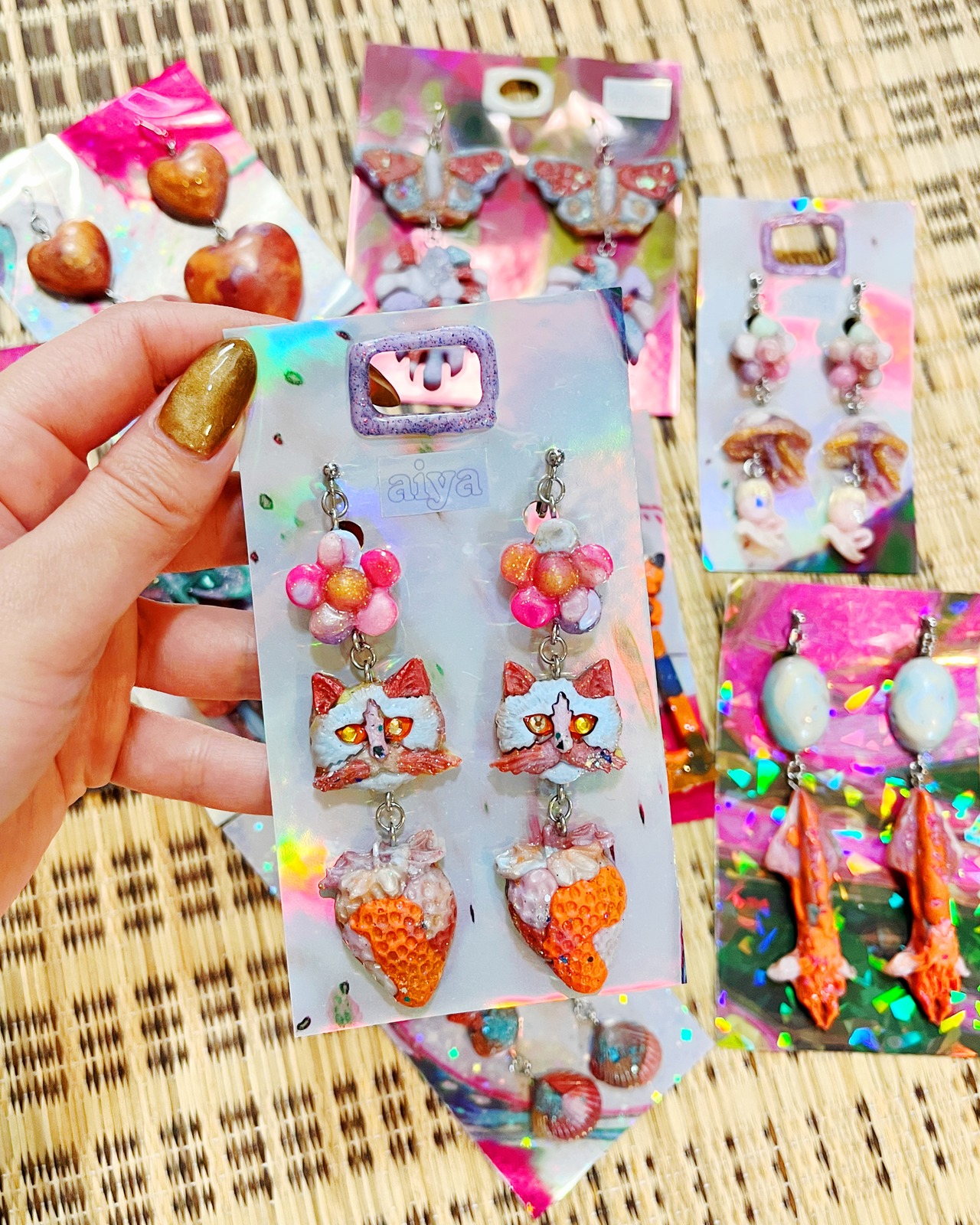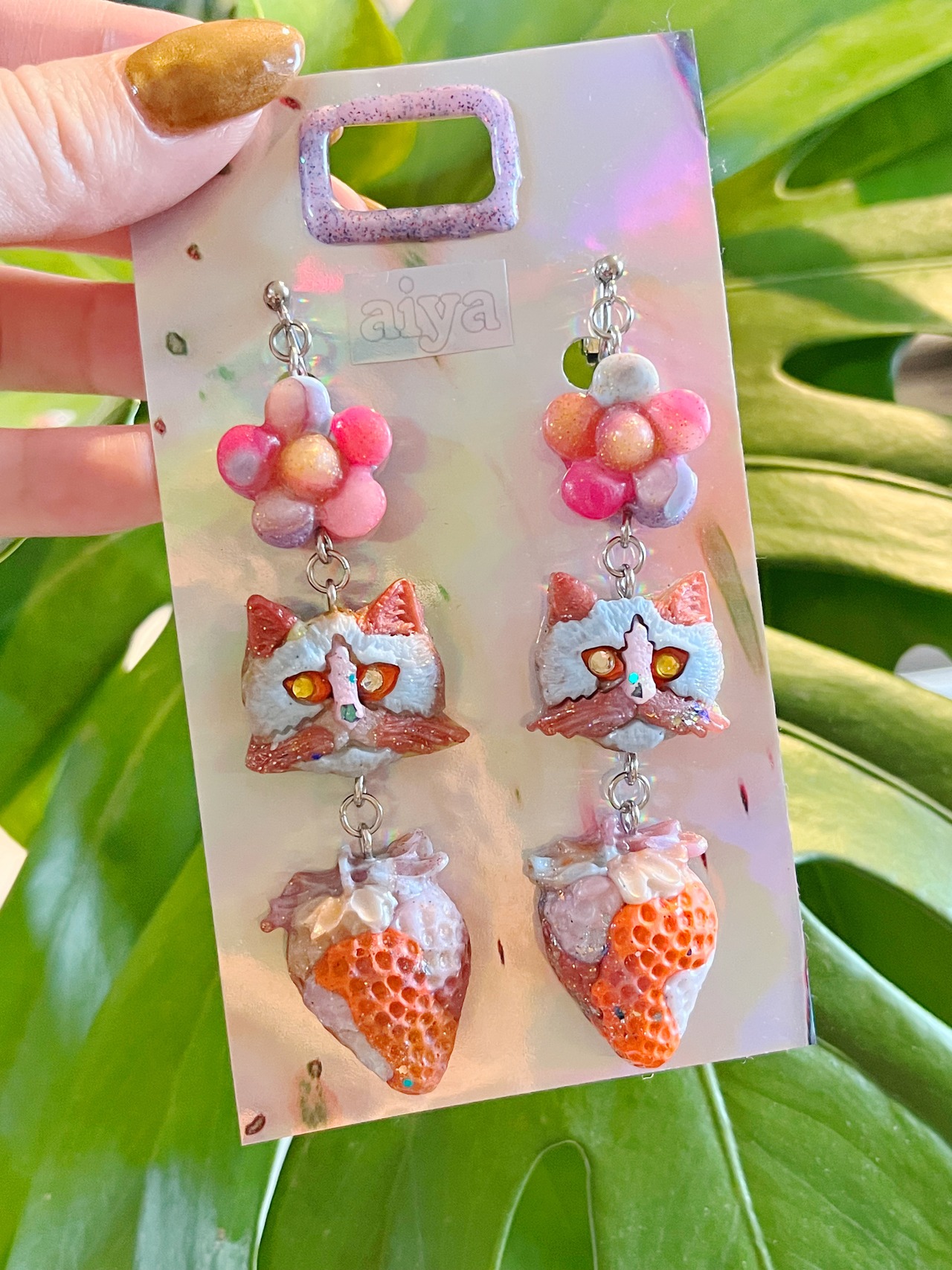 オッドアイの猫と苺、お花のモチーフで作ったユニークなデザインのアイテムです。