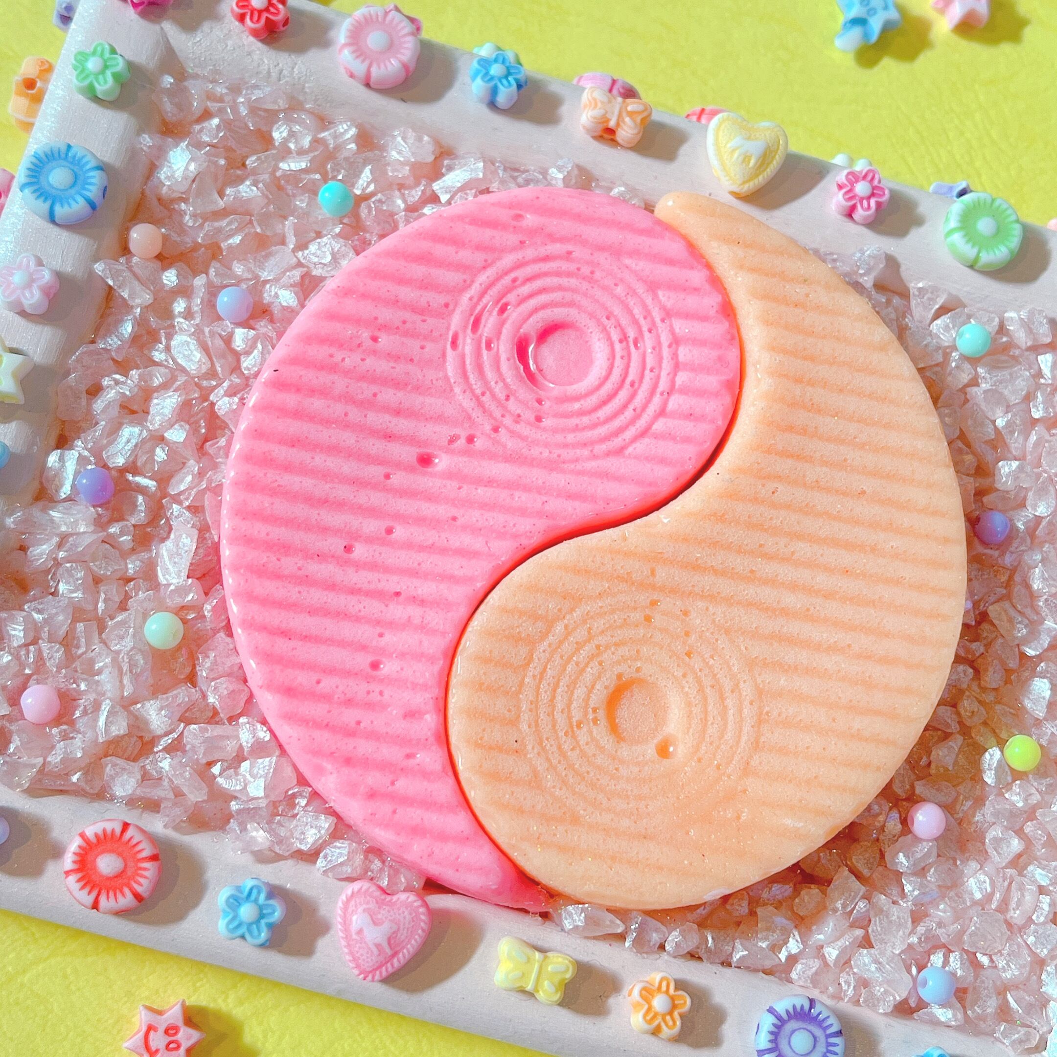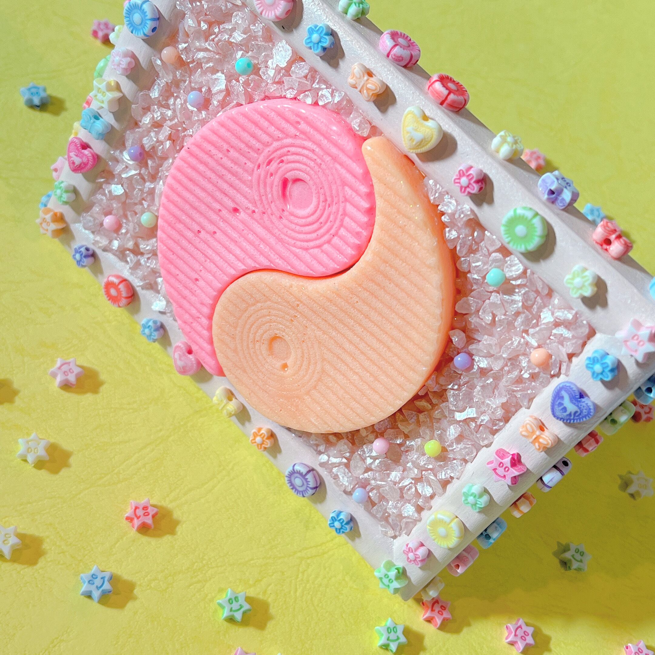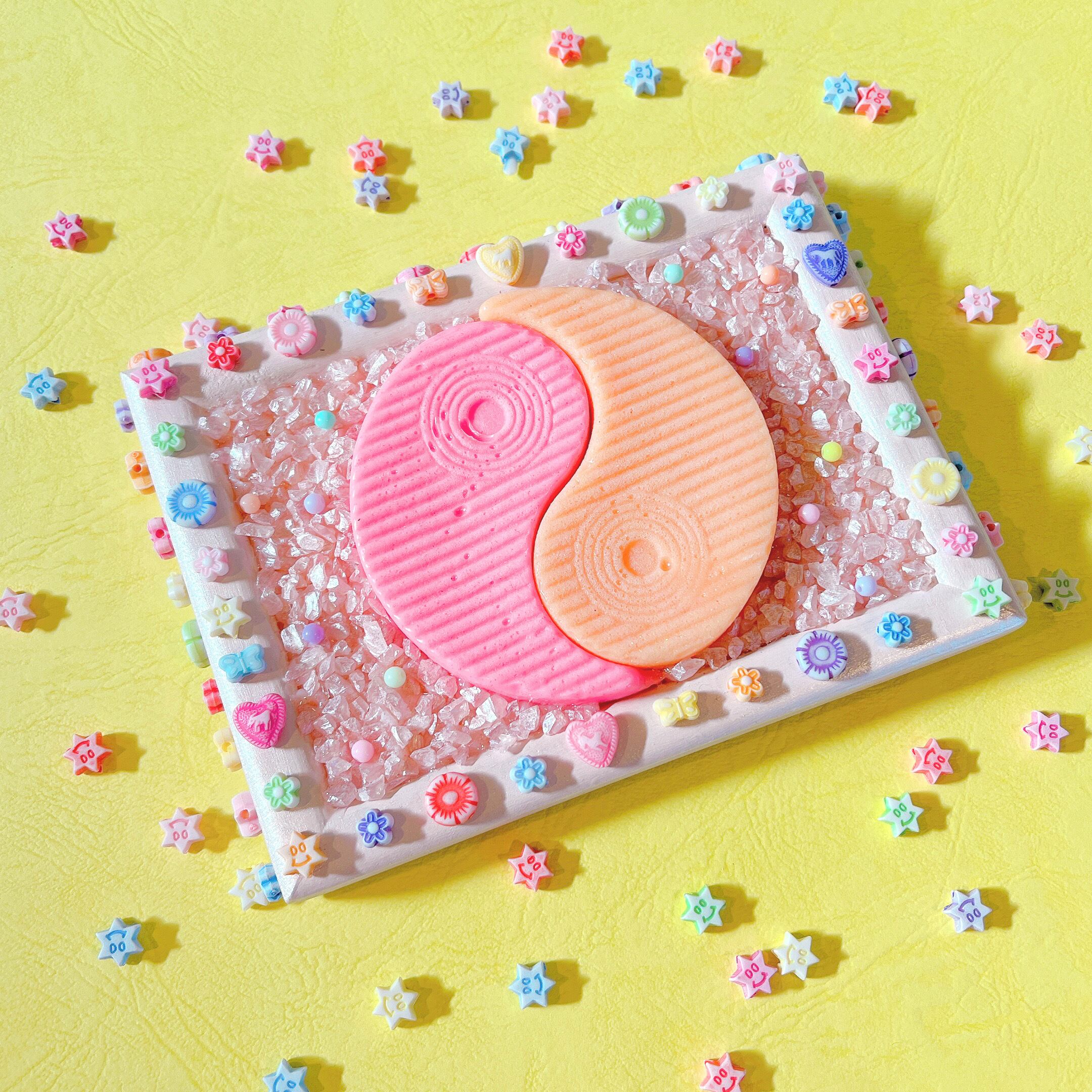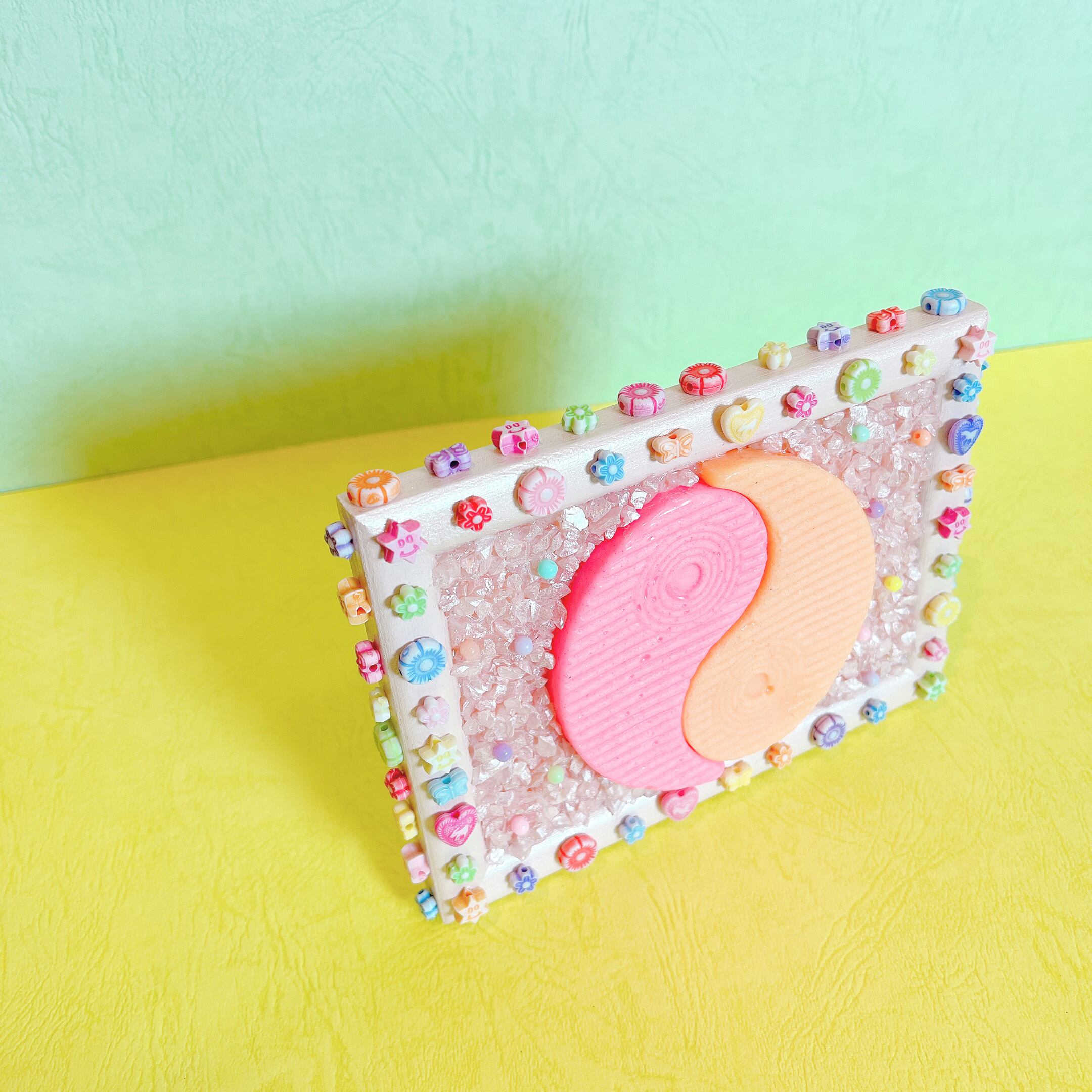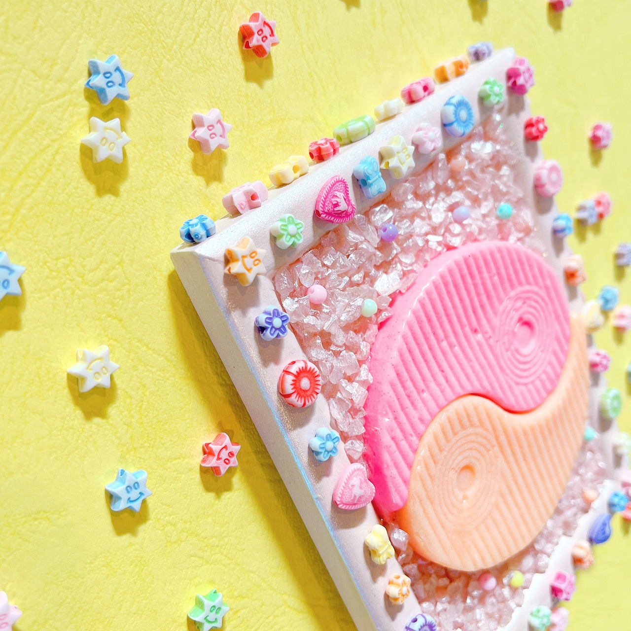 パステルカラーのインヤンマークにお菓子のようなビーズをたっぷり使った作品です。