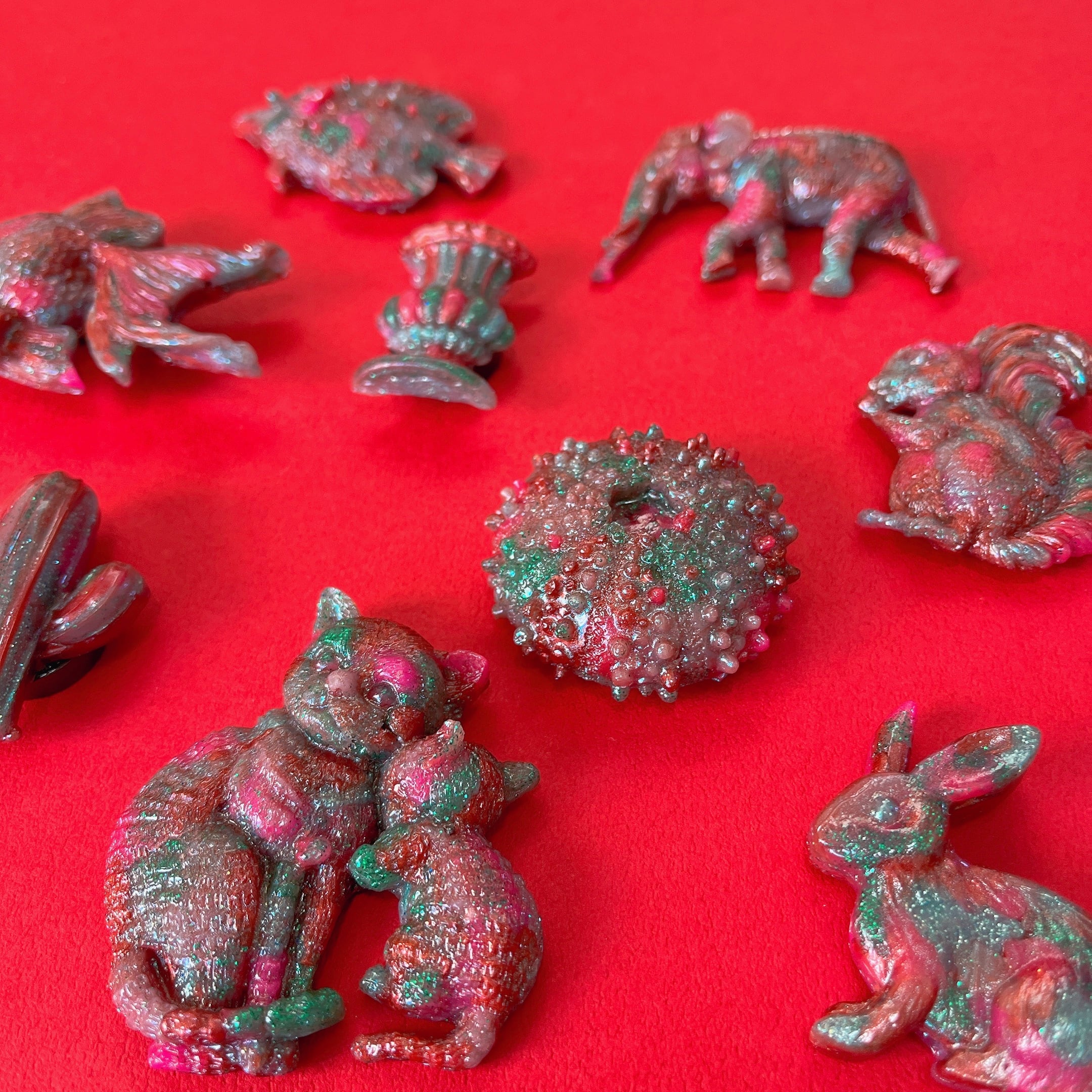 赤、緑、ピンク、水色、薄紫…などたくさんの色を使ってパーツを作りました。