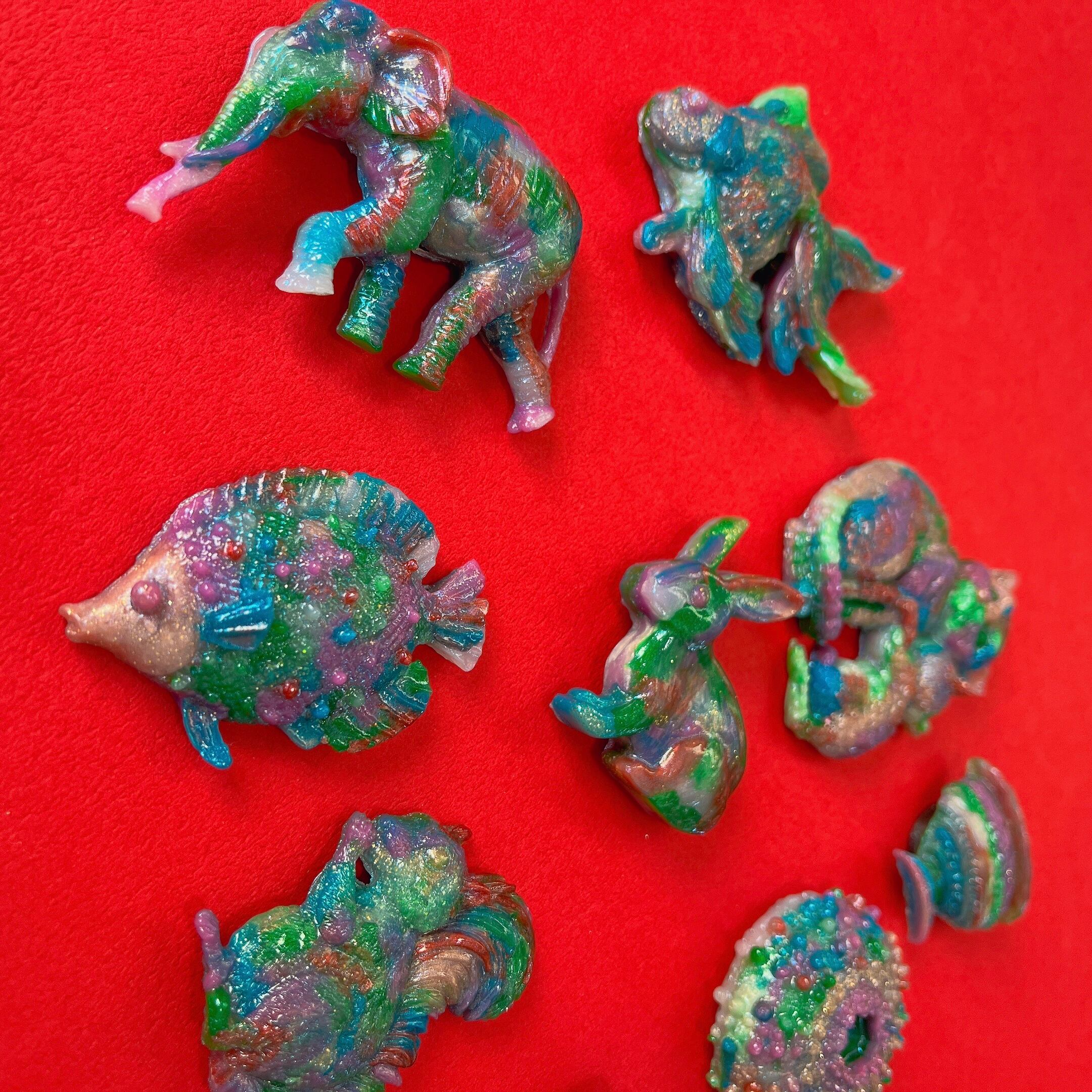 青、紫、オレンジ、緑、シルバー…などたくさんの色を使ってパーツを作りました。