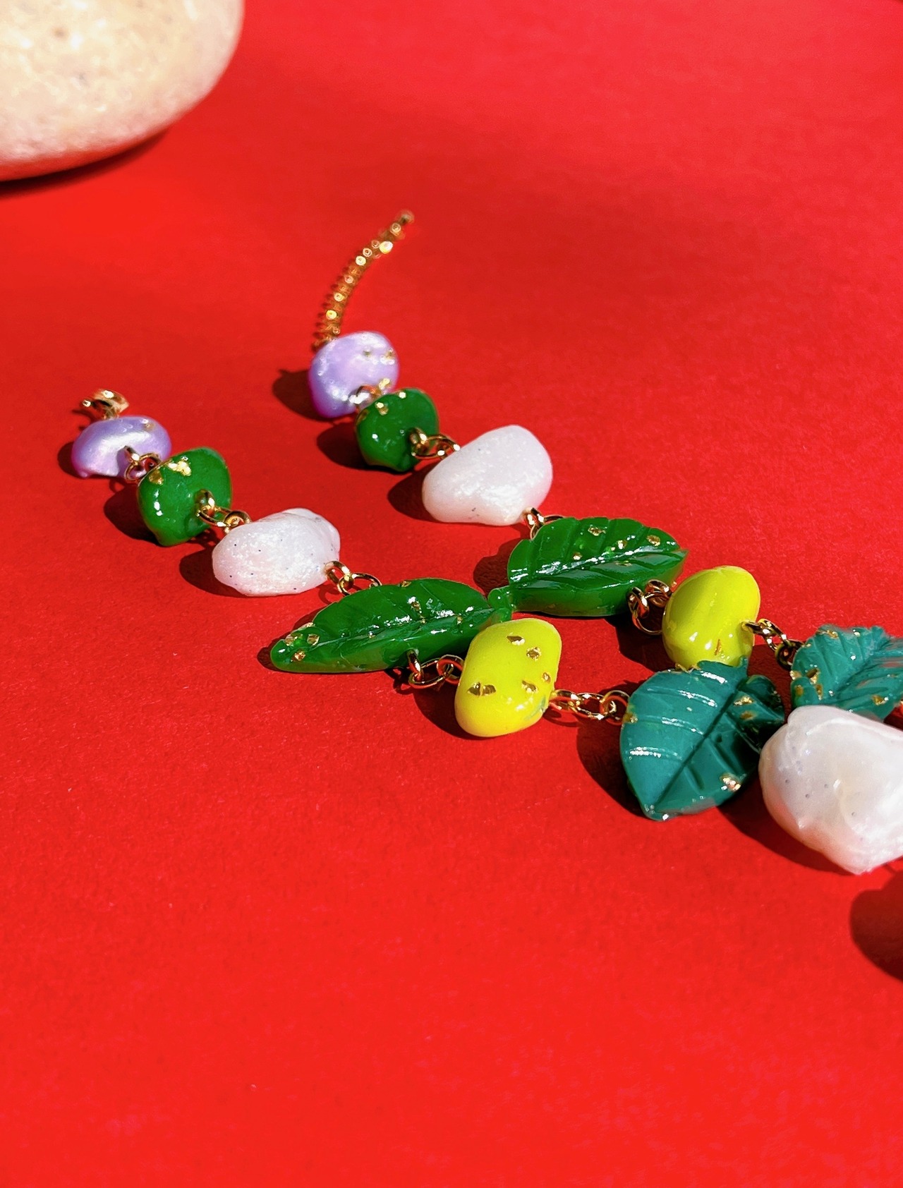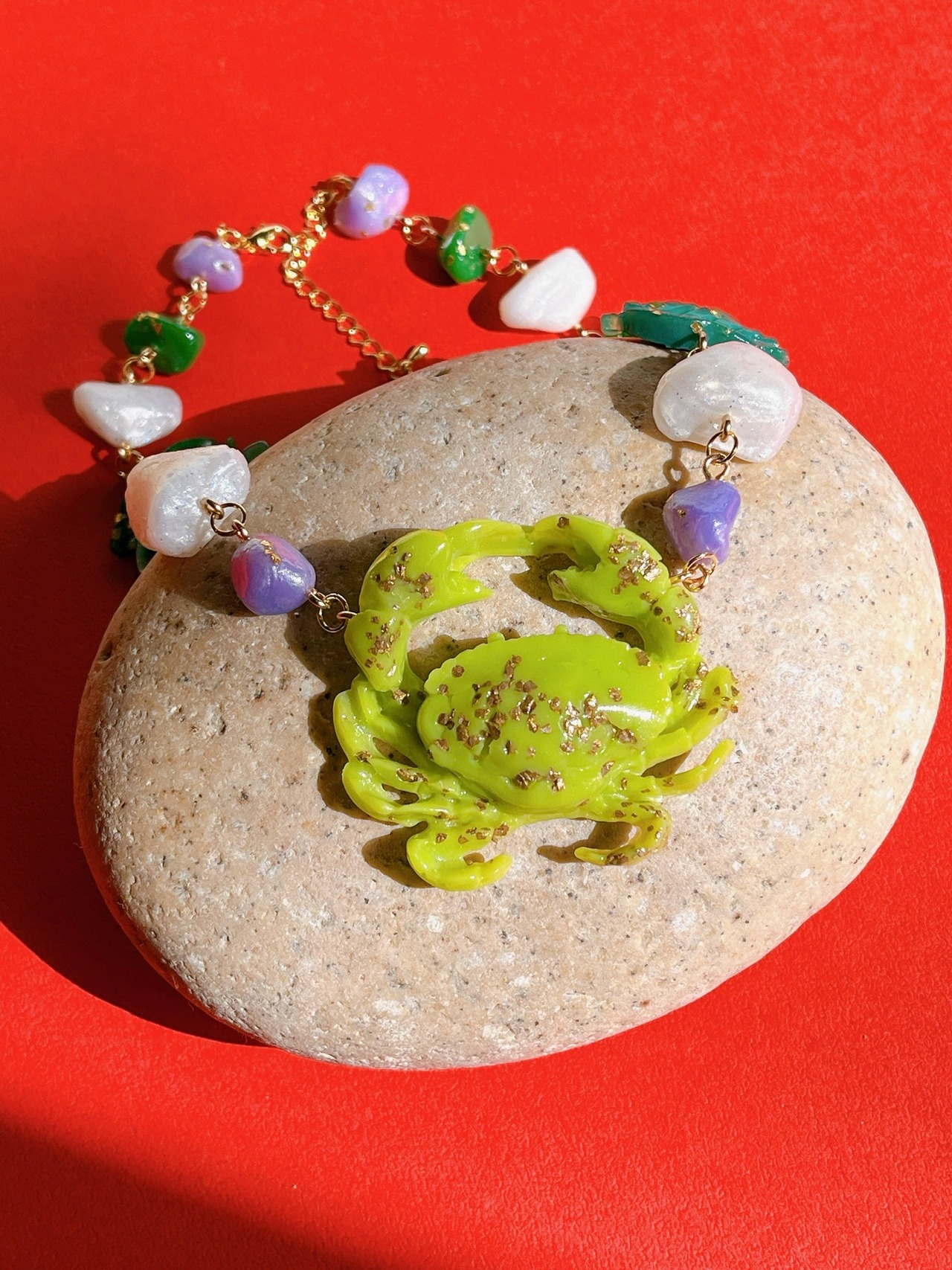 明るいミントグリーンのカニとグリーン系でまとめたリーフ、フェイクストーンのパーツで、爽やかさとエレガントな雰囲気を合わせた唯一無二のアイテムに仕上げています。