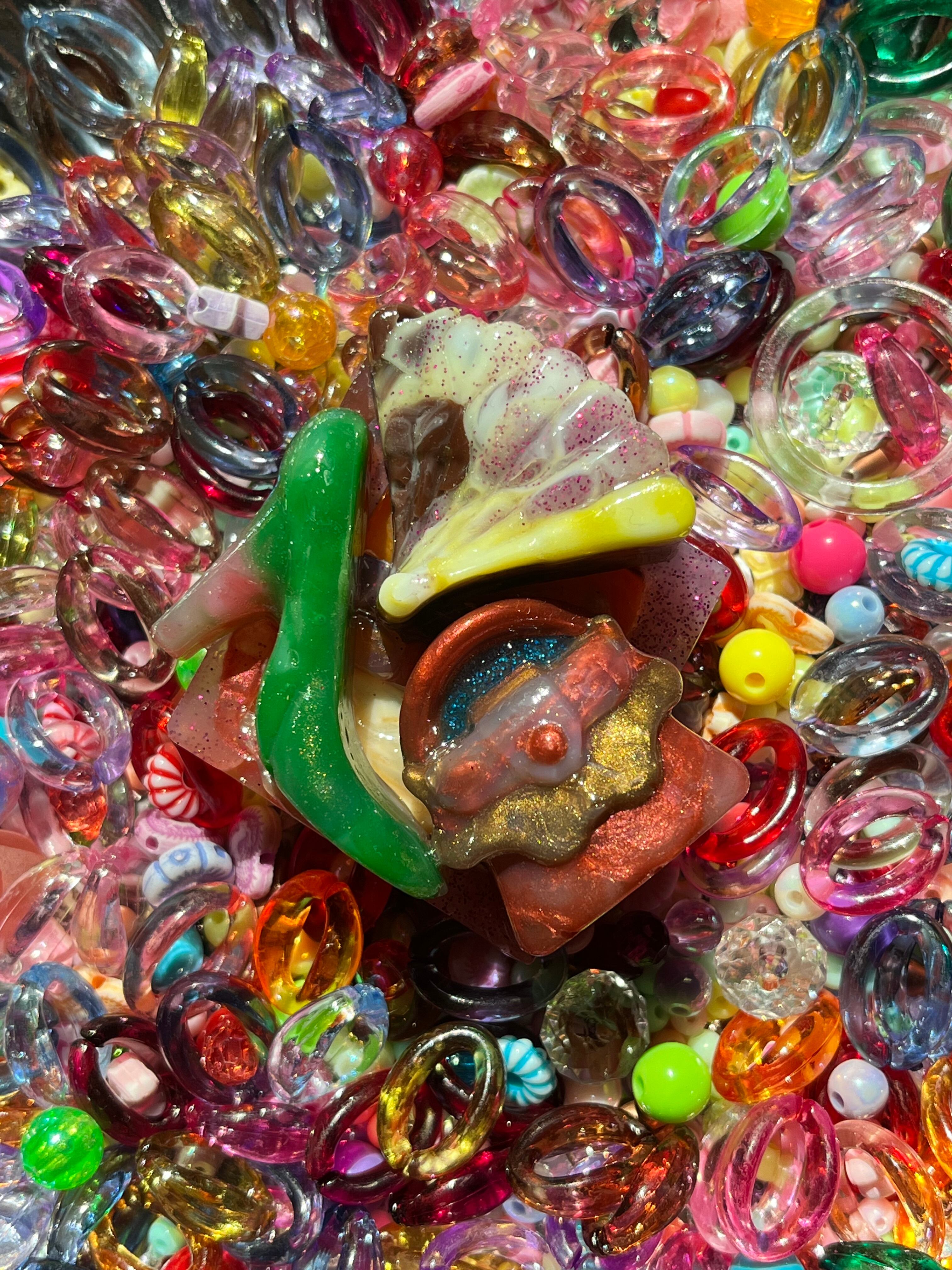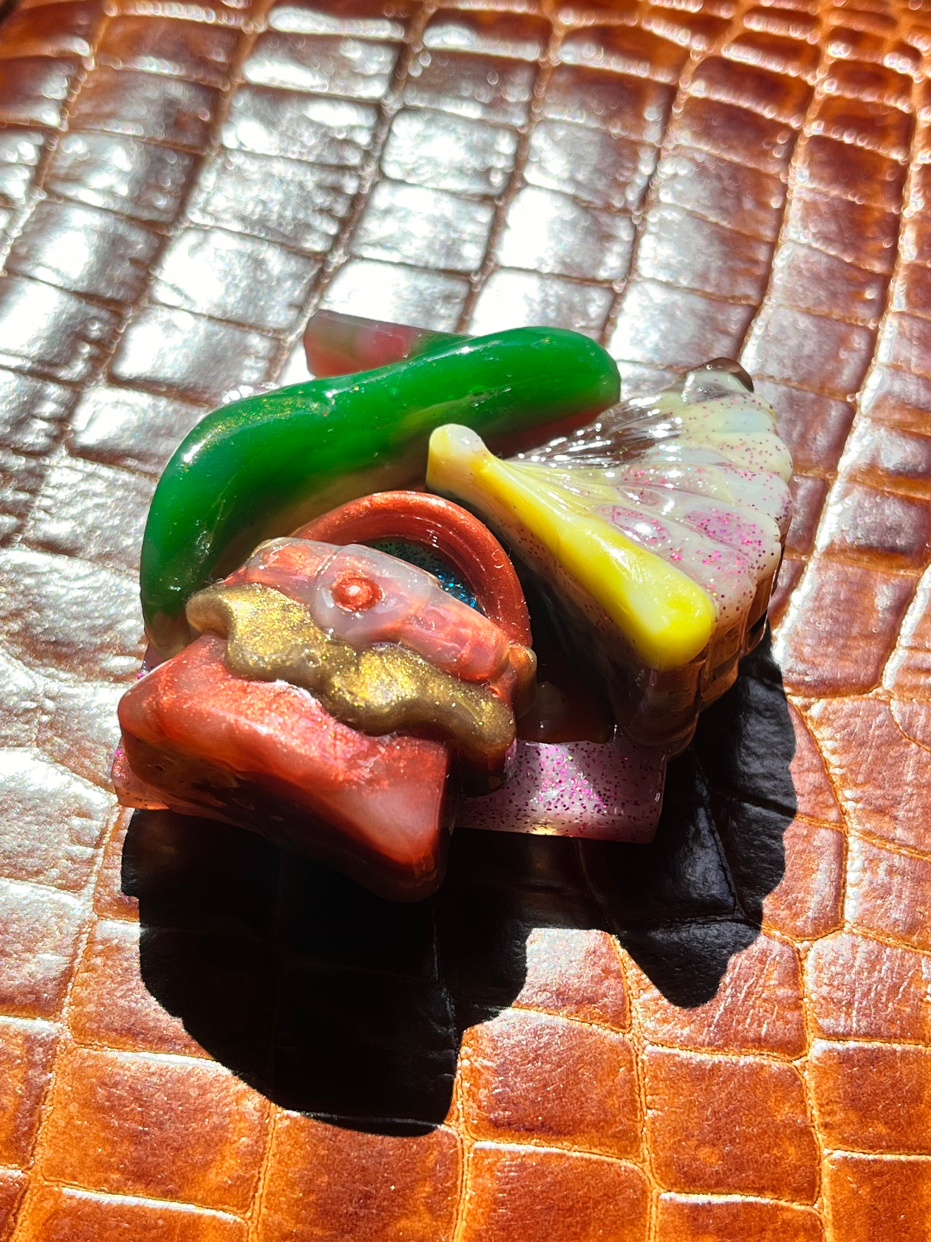 バッグにハイヒール、扇子、3つのおしゃれアイテムを組みあわせたユニークなデザインのマグネットです。