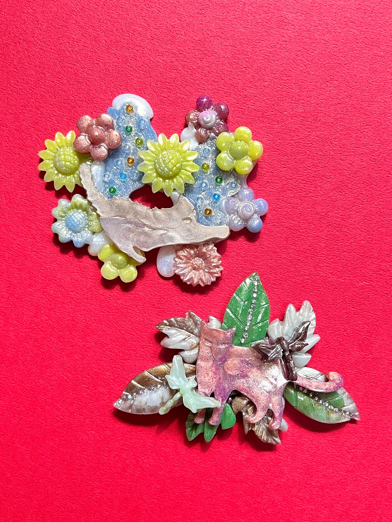 伸びている猫ちゃんとお花、ひとつずつ付けたビーズがかわいいです。オーロラカラー。
